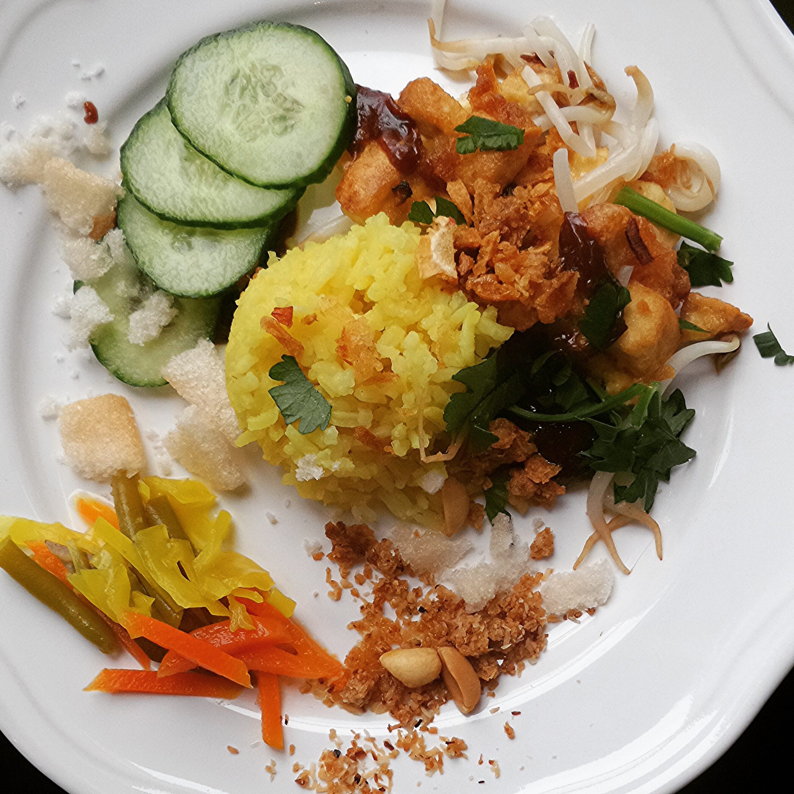 - Nasi kuning, gele rijst gegarneerd met omelet en gebakken uitjes